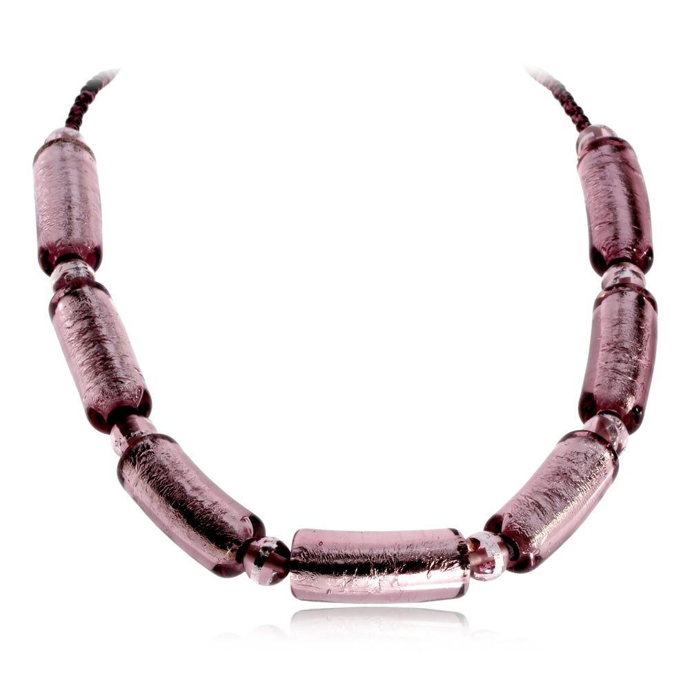 Velmi výrazný náhrdelník ručně vyrobený z tzv. vinutých perel je tvořen z válečků, které jsou od sebe oddělené kuličkami - vše v jednotné růžovo-fialové barvě. Zajímavost výroby tohoto náhrdelníku spočívá v tom, že v jedné z vrstev skla je aplikováno plátkové stříbro po celé šíři válečku. Stříbro prosvítá barvou skla, které tím jakoby zevnitř září. Jedná se o velmi starou techniku sklářské výroby.