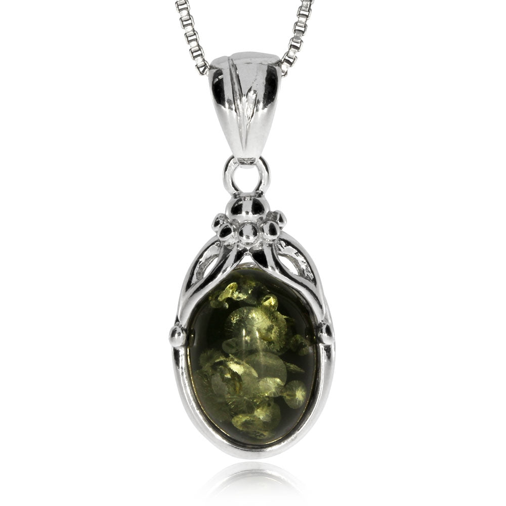 Stříbrný přívěsek - Zelený jantar v ozdobném oválu